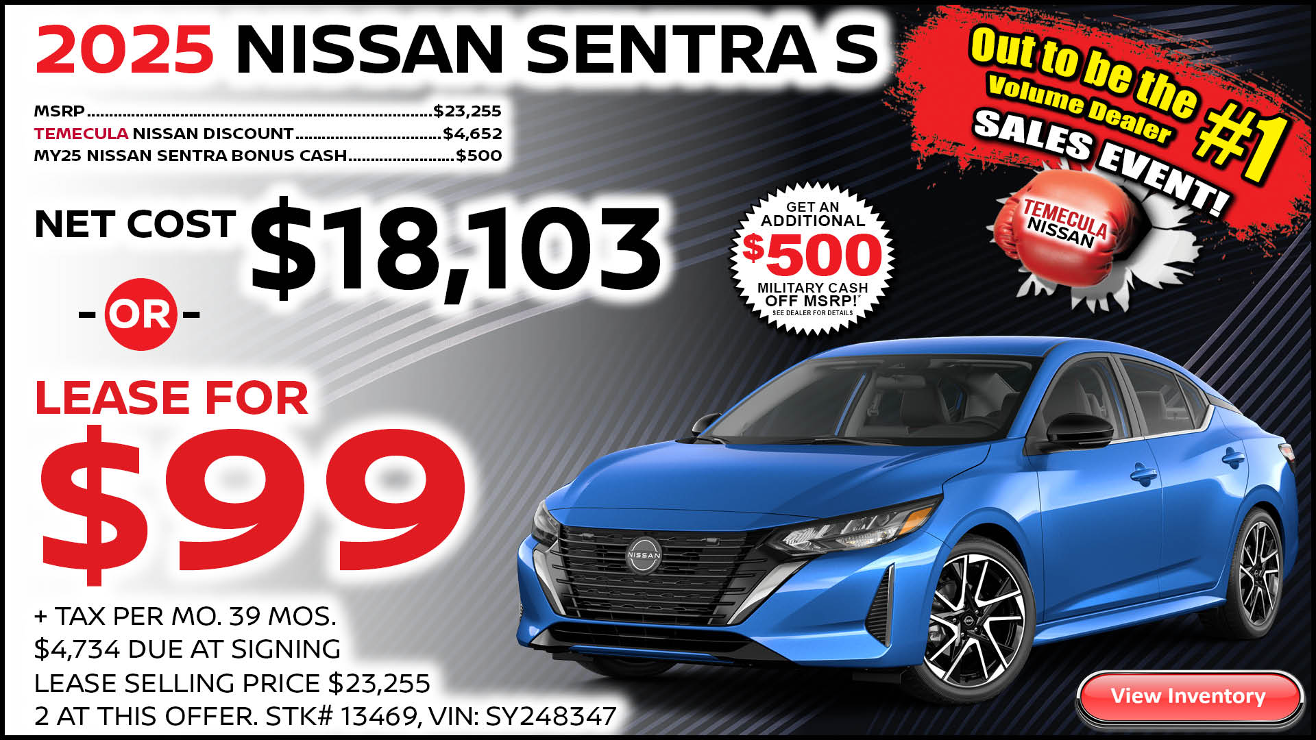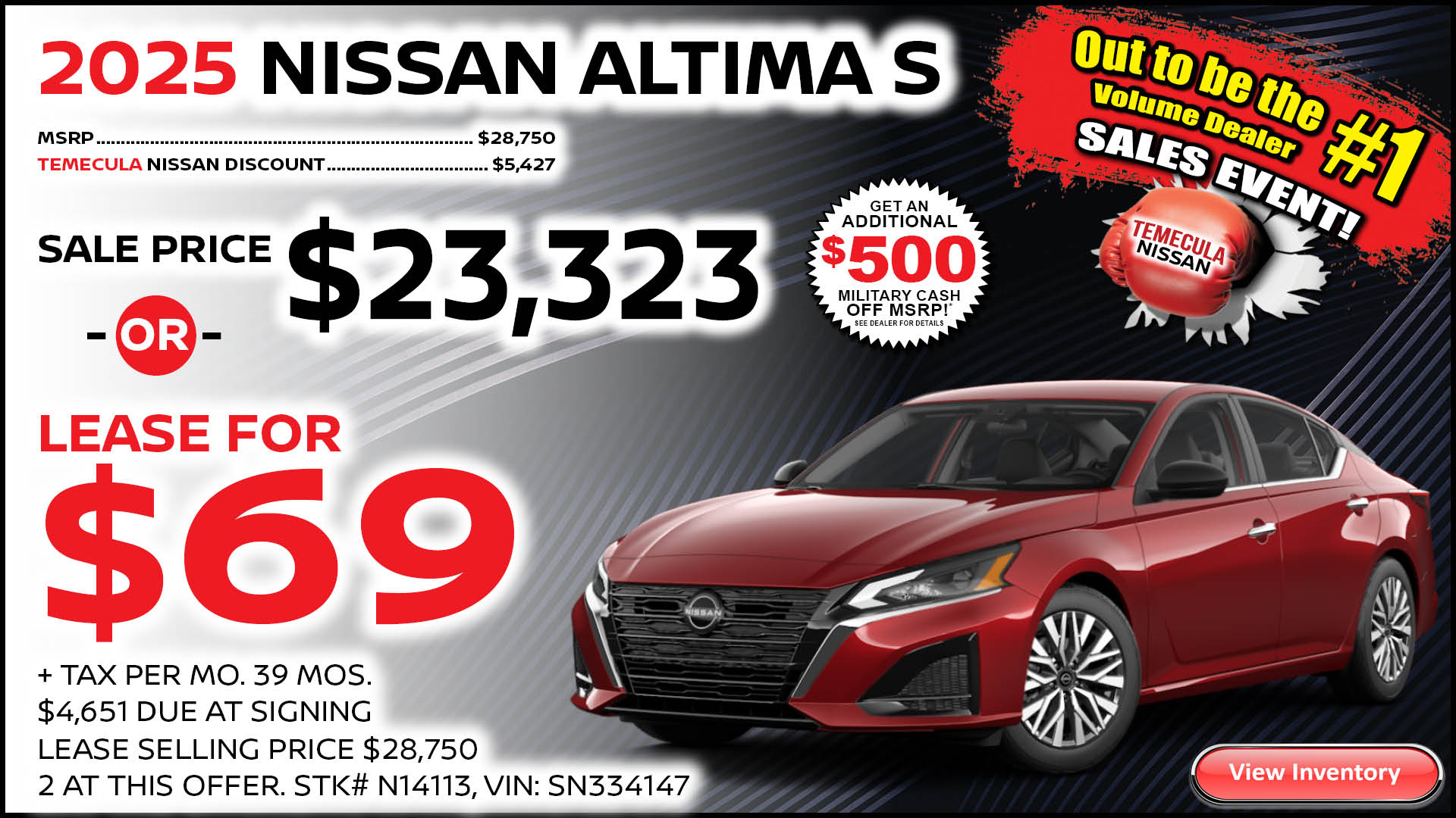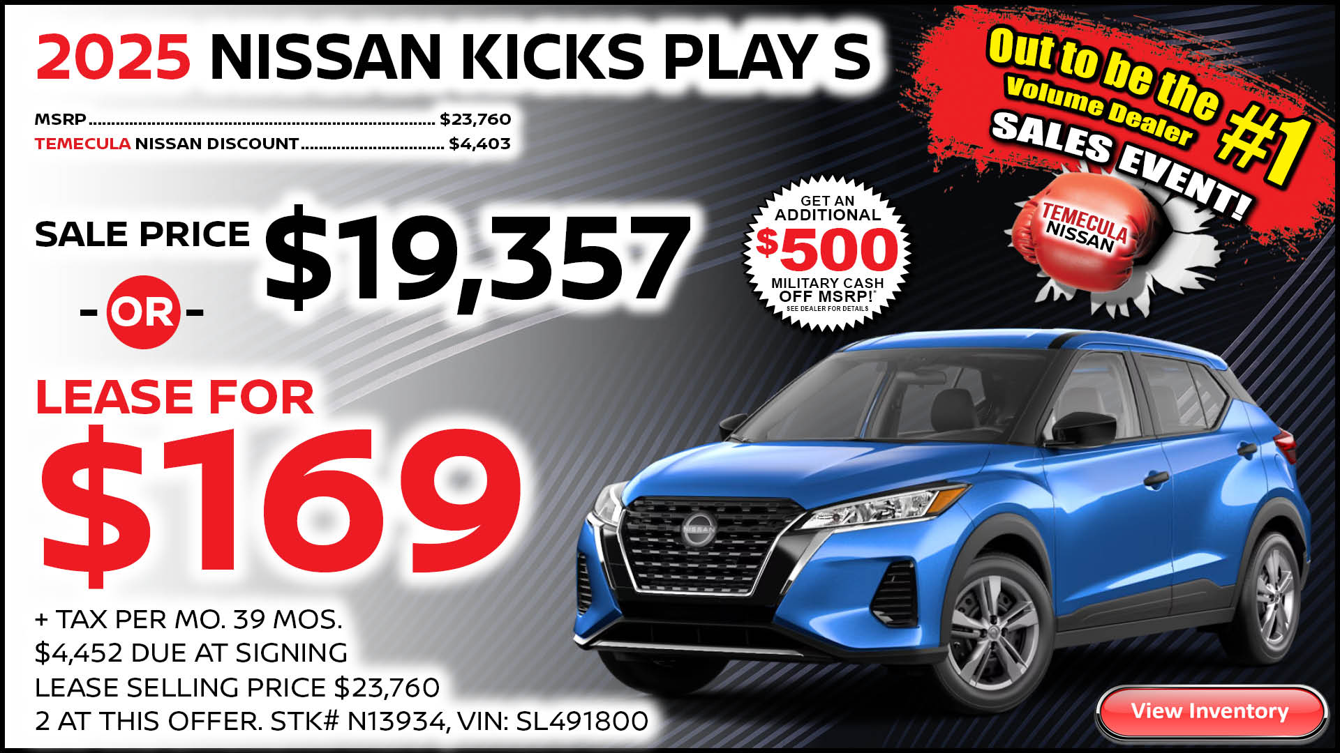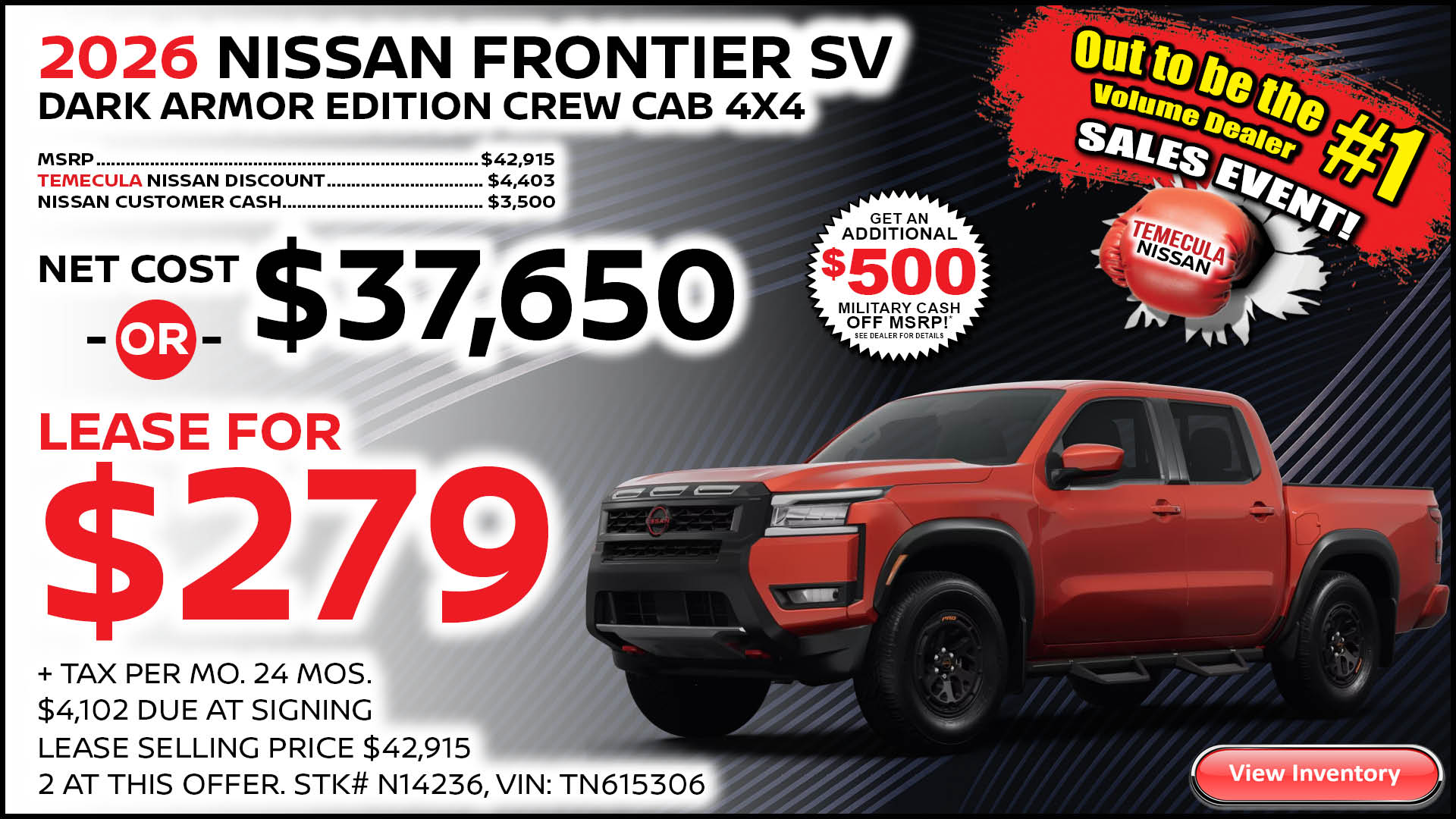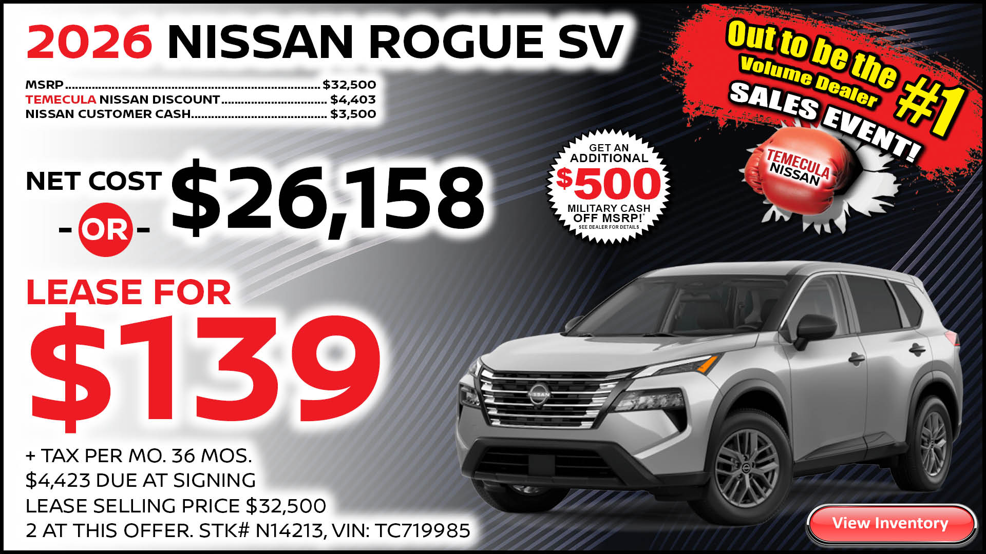 Ultra-low-mileage lease for well qualified lessees (Tier 1) lease a new 2026 Nissan Rogue SV FWD SUV with Model # 54316 in dealer stock for $139 per month for 36 months. Initial payment excludes taxes, title, and license (TTL). $4,562.25 due at lease signing (includes: $4,423.25 down payment, $139 first month payment). Monthly payment includes: Lease Cash: $1,325.00). Offer valid only when financed through NMAC. Subject to residency restrictions. $32,500 MSRP. Net capitalized cost of $23,514.90 includes a $695 non-refundable acquisition fee. Monthly payments total $5,004 at lease end, purchase for $21,125.00, plus purchase option fee up to $300 (except KS & WI), plus tax, or pay excess wear & use plus $0.25 per mile for mileage over 5,000 miles per year. Disposition fee due at lease end. No security deposit required. Must take delivery from Temecula Nissan new dealer stock. Contact Temecula Nissan for details. Lease Offer Ends 02/02/2026. The NMAC SignatureFLEX Lease Program is available on any Nissan model year 2020 or newer from new dealer stock leased through Nissan Motor Acceptance Company (NMAC) with an original or adjusted lease maturity date of 2/1/2025 or later. After lease signing, Program Lessee can purchase additional mileage at $0.10 per mile through the NMAC customer portal or mobile app up to 30 days before Program Lessee’s lease maturity date provided Program Lessee’s account is current and in good financial standing as solely determined by NMAC. Purchase of additional mileage is subject to sales tax. No refund or credit on unused miles. At lease end, pay excess wear & use plus $0.25 per mile (for mileage over the original lease agreement of 5,000 miles per year). Contact Temecula Nissan for details. Offer is subject to change at any time and/or is subject to termination without notice. *Eligible individuals include U.S. Active and Reserve Military, U.S. Military Veterans within 24 months of separation from Active or Reserve duty, U.S. Military Retirees who have completed at least 20 years of Active or Reserve duty required. Military cash available towards the lease or purchase of the advertised new Nissan model from dealer stock. Limit up to 2 vehicle leases or purchases per calendar year per qualified participant for personal use only. Offer not valid for fleet or business use. Available on lease or purchase. Must take delivery from new dealer stock. Offer is subject to change at any time. Other restrictions apply. Offer is subject to change at any time. Prices do not include dealer added equipment, final sales price, additional fees and costs of closing, including government fees and taxes, any finance charges, any dealer documentation fees, emissions testing fees, $85.00 dealer documentation fee, or other fees. See dealer for complete details. Offer ends 02/02/2026.